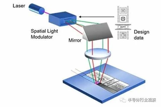 光學原理通常是使用激光通過DMD鏡面列陣來控制激光輸出的圖形,從而使晶圓上被曝光的圖形符合layout的原始設計,稱為laser writer。從目前公開的信息可知,大多數laser writer的光源為波長在300~400nm之間的紫外光,分辨率可達到為500nm至數微米之間,高分辨率條件下也會犧牲相當的產能。