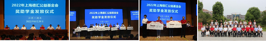 2022年8月29日上午,上海德匯公益基金會2022年度(第六屆)助學獎學頒證儀式在江蘇省淮安市漣水中學順利舉行,儀式上發放了年度助、獎學金。集團公司和漣水縣委、縣政府、縣慈善總會、教育局等相關部門負責人、教師代表、家長代表和受助獎學生出席儀式。儀式由縣政府副縣長馬榮主持。本屆助學獎學項目資助獎勵在今年高考、中考中取得優異、優秀成績的漣水縣學生,共計100萬元。其中,高考縣文、理科成績優異的費暢和鄭加樂各得10萬元獎學金;高考文、理科前10 名學生,各得2萬元助獎學金;今年中考考入漣水中學品學兼優的貧困學生各得1萬元的資助金。