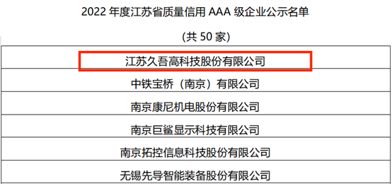 2022年3月21日,江蘇久吾高科技股份有限公司啟動了“2022年度江蘇省質量信用AAA級企業等級認定”申報工作,旨在圍繞質量信用等級認定工作的各項技術指標,結合公司的管理體系和績效管理模式,重點展現出久吾高科在經營管理方面的方法、過程,以及取得的成效。2022年度江蘇省質量信用AAA級企業等級認定名單發布,通過的企業僅有50家,久吾高科順利入圍,并獲此殊榮。