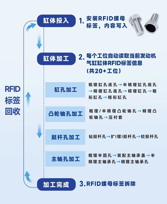 為什么選擇RFID技術?在發動機氣缸缸體的生產過程中,由于涉及機械加工、噴涂和表面清洗處理等多種工藝,會產生油污和液體,傳統條碼方案在如此惡劣的生產環境中無法得到有效使用,企業最終選擇抗金屬抗液體的RFID螺母標簽搭配RFID固定式讀寫器的方案來實現信息實時讀取。