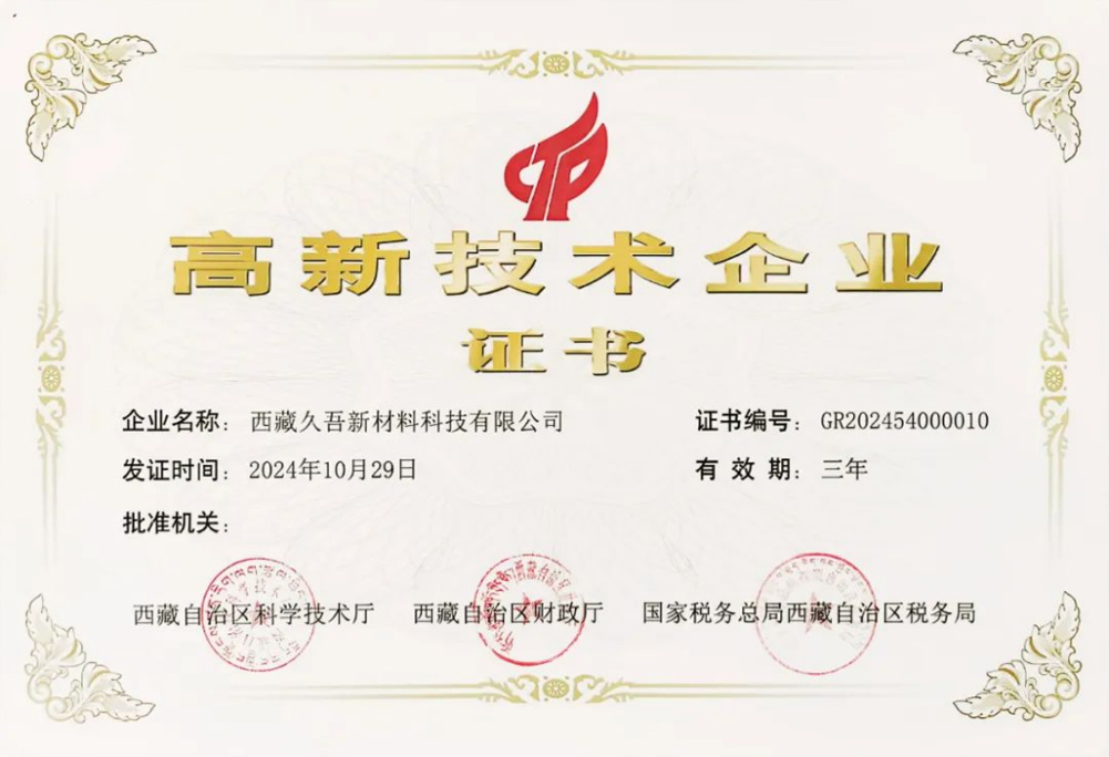 近日,全國高新技術企業認定管理工作領導小組辦公室公布了西藏自治區認定機構2024年認定報備的第一批高新技術企業名單,久吾高科全資子公司西藏久吾新材料科技有限公司(以下簡稱:西藏久吾)成功入圍,這是藏青工業園區第二家獲得高新技術企業認定的企業,標志著西藏久吾在科技創新與企業發展道路上邁出了堅實而重要的一步。