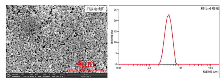 粉體形貌類球形、無團聚;粉體粒徑達到納米級且粒徑分布窄、一致性好