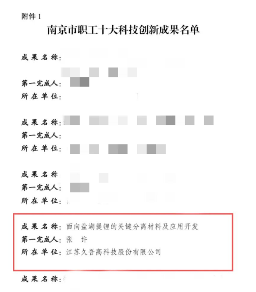近日,南京市總工會、市科學技術局、市工業和信息化局、市知識產權局四部門聯合發布2025年度南京市職工科技創新系列榜單。久吾高科鹽湖提鋰團隊研發的“面向鹽湖提鋰的關鍵分離材料及應用開發”成果,憑借硬核技術脫穎而出,成功入選“南京市職工十大科技創新成果”,彰顯了企業用自主創新的鏗鏘步伐,為綠色能源產業發展注入強勁動能。